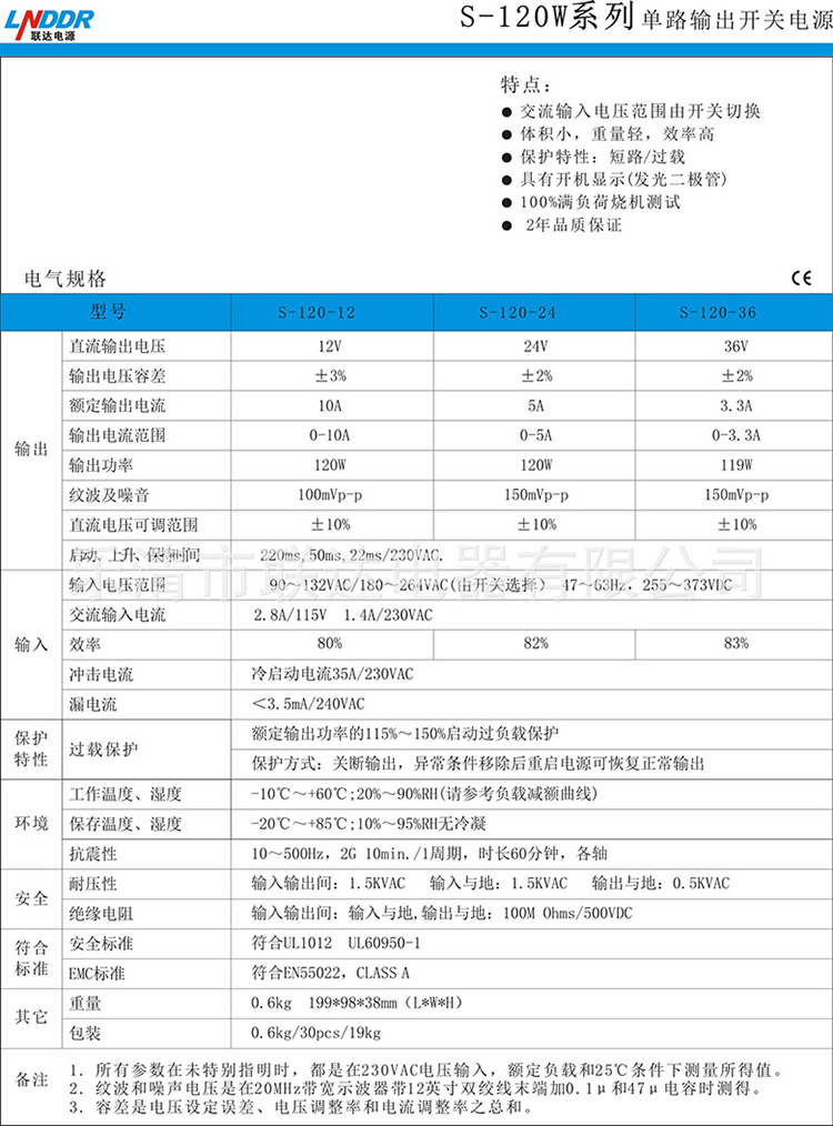批發 S-120W-12V10A單路輸出開關電源 穩壓電源 防水電源 質保2年
