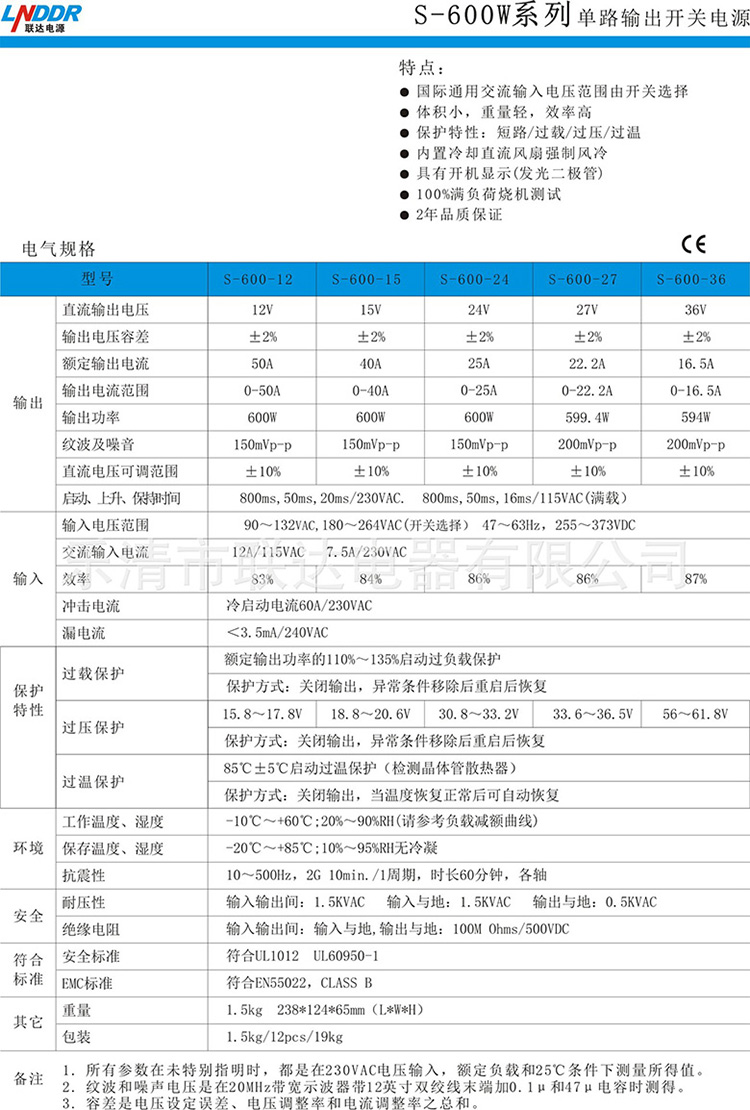 聯達電器 S-600W-12V50A單組輸出 開關電源 工控電源 機械電源